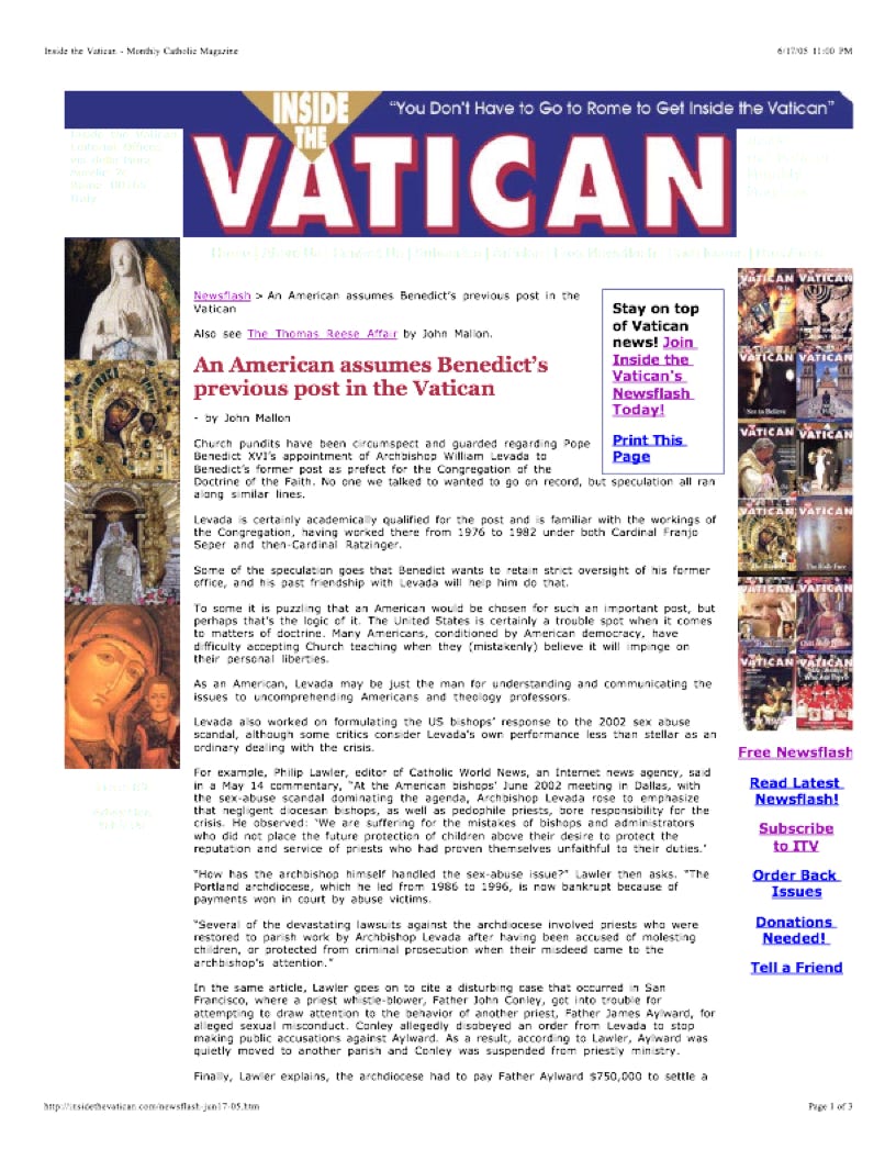 In the same article, Lawler goes on to cite a disturbing case that occurred in San Francisco, where a priest whistle-blower, Father John Conley, got into trouble for attempting to draw attention to the behavior of another priest, Father James Aylward, for alleged sexual misconduct. Conley allegedly disobeyed an order from Levada to stop making public accusations against Aylward. As a result, according to Lawler, Aylward was quietly moved to another parish and Conley was suspended from priestly ministry.